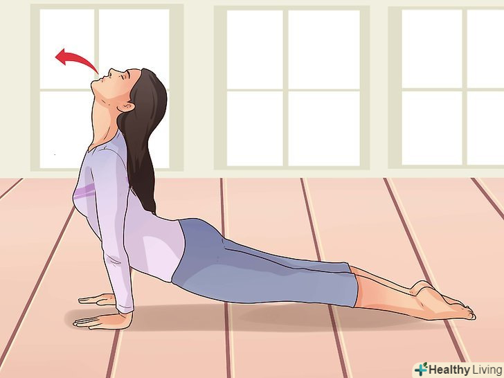 - Перекотіться пальцями ніг так, щоб верхні склепіння стоп лягли на підлогу. Продовжуйте напружувати м'язи стегон і намагайтеся відірвати їх від підлоги; відштовхуючись руками від підлоги, як би проштовхуйте грудну клітку вперед і вгору між рук. Акуратно прогніться в грудному відділі спини, наскільки це можливо, намагаючись якомога краще розкрити грудну клітку. Погляд направте в стелю. [64]