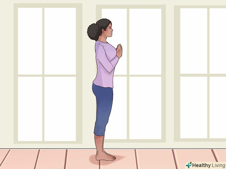Встаньте в Тадасану (позу гори). щоб почати комплекс, встаньте в Тадасану (позу гори) на краю килимка . Так найпростіше почати привітання з позиції стоячи. [6]- Щоб прийняти позу гори, потрібно встати на початку килимка і з'єднати стопи разом (п'яти і великі пальці ніг стосуються один одного), руки витягнути з боків. Погляд направте вперед, пальці ніг по можливості відведіть один від одного і щільно притисніть до килимка; переконайтеся, що вага рівномірно розподілений між стопами. [7]