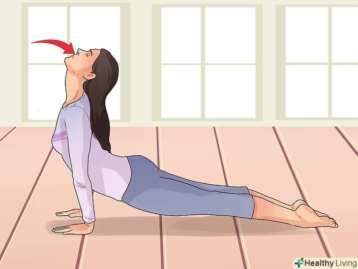 - Перекотіться пальцями ніг так, щоб верхні склепіння стоп лягли на підлогу. Продовжуйте напружувати м'язи стегон і намагайтеся відірвати їх від підлоги; відштовхуючись руками від підлоги, як би проштовхуйте грудну клітку вперед і вгору між рук. Акуратно прогніться в грудному відділі спини, наскільки це можливо, намагаючись якомога краще розкрити грудну клітку. Погляд направте в стелю. [27]