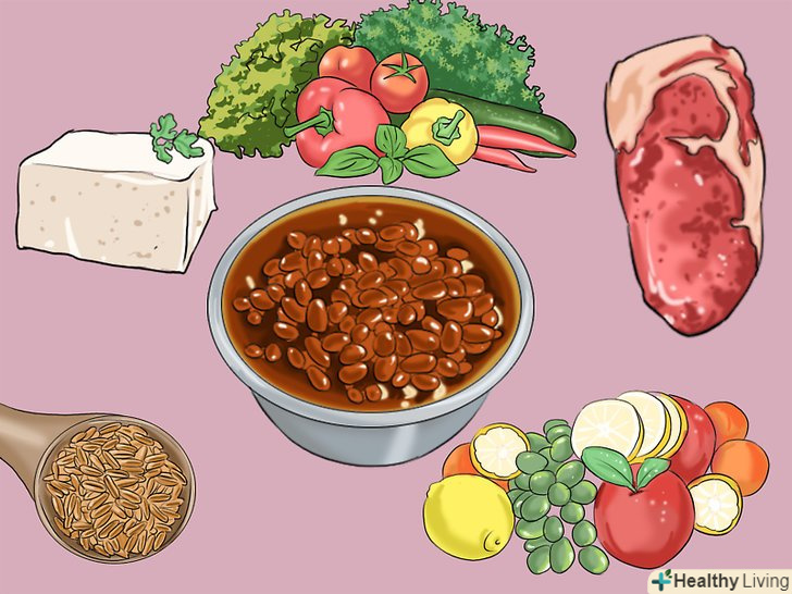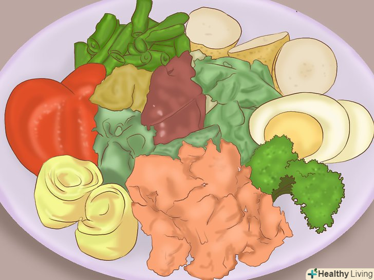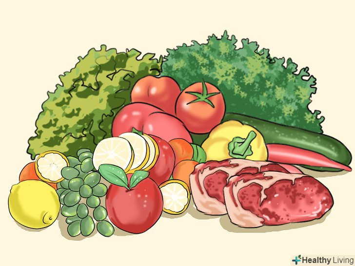 Переконайтеся, що ваша дієта складається переважно з сирих, необроблених продуктів. їжте багато овочів, фруктів, білкових і цільнозернових продуктів. Віддавайте перевагу поживним і калорійним продуктам з низьким вмістом жирів, а також волоконної їжі.- Уникайте газованої води та цукру. Не вживайте алкоголь у великих кількостях.
