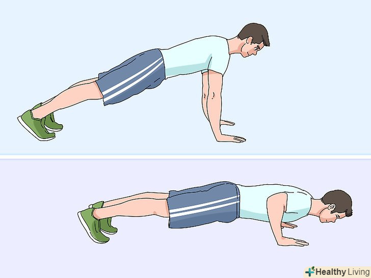 Загальнорозвиваючі вправи: віджимайтеся, починаючи з 3 підходів по 10. Виконайте перший підхід, не відриваючи колін від підлоги, що також називається дівочими віджиманнями, а при наступному підході підніміть коліна з підлоги, а для останнього підходу Підніміть ваші стопи від підлоги (якщо можливо).