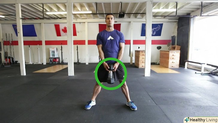Візьміть одну гантель. Тримайте гантель двома руками, по краях гантелі.- Розташуйте ступні. Вони повинні бути розташовані трохи ширше плечей, шкарпетки розгорнуті під кутом 45 градусів.