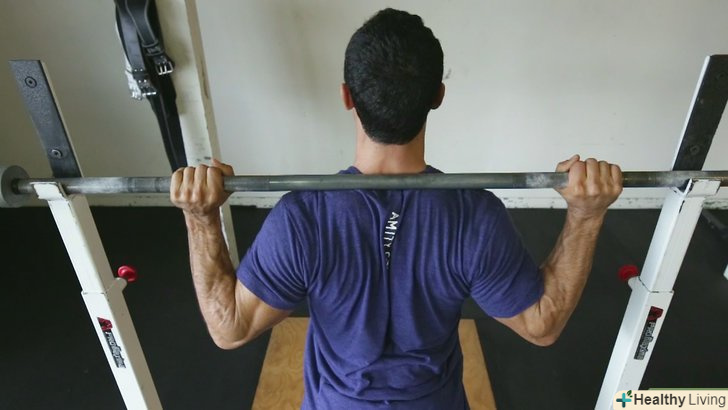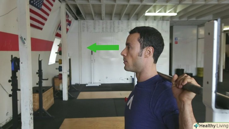 - Розташуйте вагу. Розташуйте гриф нижче шиї, на грудях, паралельно ключиць. Візьміться за гриф знизу, за місця, комфортні для Вас, зазвичай 15см ширше плечей.