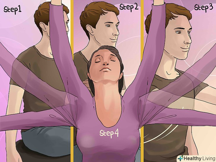 Сядьте на стілець з жорсткою спинкою. почніть з того, щоб повністю випрямити спину і підняти голову. Ноги поставте на землю, руки з боків. Це вихідна позиція для кожної вправи на розтяжку і поворот. [2]