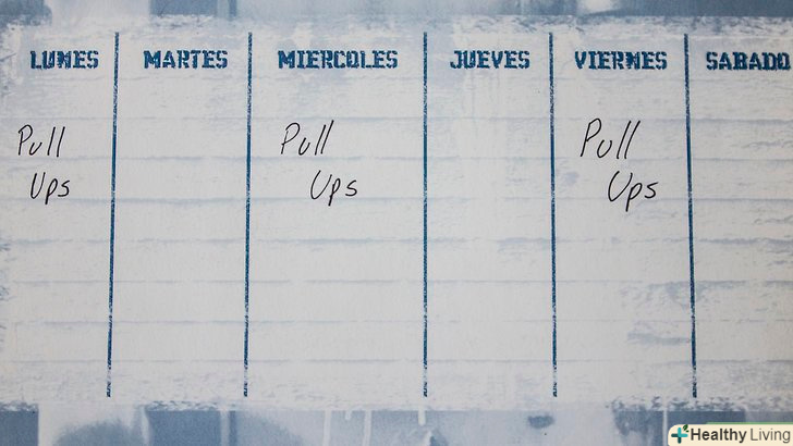 Складіть розклад вправ. для того щоб підготувати своє тіло до виконання підтягувань, необхідно кожен день виконувати одне з підготовчих вправ. Складіть розклад, в якому вправи будуть чергуватися, і не забудьте включити в нього дні відпочинку. [4]- Почніть з вправ на ВІС. Робіть кілька підходів по 20-30 секунд з перервою між ними в 1-2 хвилини. Щоб розвинути м'язи, вис треба виконувати через день.