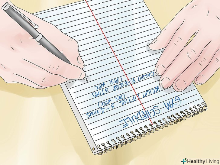 Заведіть розклад відвідування спортзалу. постарайтеся пристосуватися так, щоб в тиждень проводити 3,4 рази тренування на підйом ваги. Між тренуваннями повинен бути один день перерви. Кардіо тренування робіть щонайменше 3 рази на тиждень по 30 хвилин. 3,4 рази на тиждень, робіть вправи на підйом тіла. У дні відпочинку, додайте в розклад розминку.- Не забувайте виділяти дні для відновлення. Якщо ви відчуваєте, що ви занадто завантажені або відчуваєте, що занадто втомилися, візьміть один день перерви, щоб ваше тіло могло відновитися. Протягом тижня чергуйте дні вправ з вагою і дні кардіо тренувань. Особливу увагу приділяйте своєму тілу, щоб воно могло під час відпочинку відновити м'язову силу.