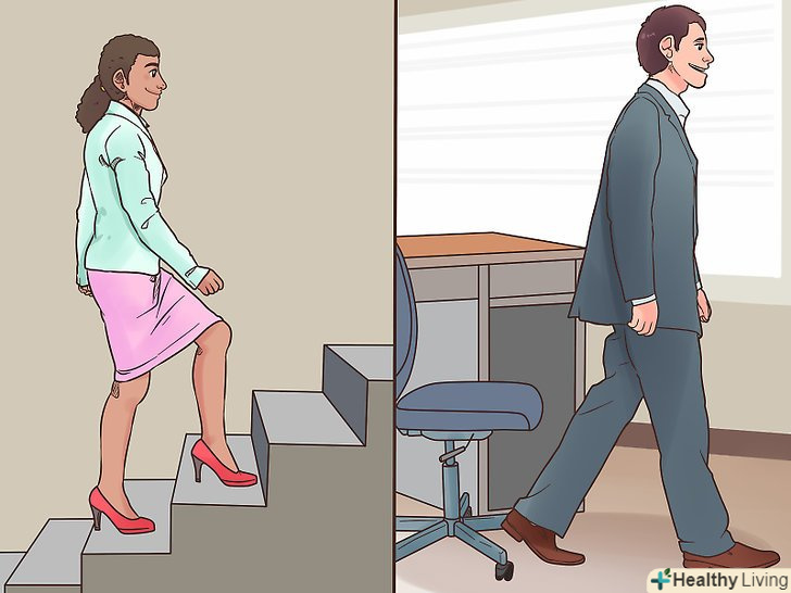 Намагайтеся більше рухатися протягом дня. Спорт-це не тільки годинні тренування в залі. Є багато інших коротких тренувань, які підійдуть для офісу або будинку. [14] можна виконувати вправи в офісі або за робочим столом і навіть давати собі кардионагрузку, не виходячи на вулицю.- Наприклад, якщо ви працюєте в офісній будівлі, під час обіду погуляйте 20 хвилин або побігайте по сходах 15 хвилин, щоб змусити серце битися частіше.
