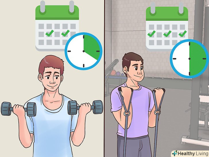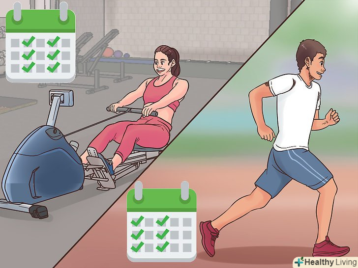 Почніть займатися частіше. З часом ви помітите, що вам стає занадто легко. Можливо, ви вирішите нічого з цим не робити, проте краще змушувати себе працювати більше. Наприклад, спочатку можна займатися два рази в тиждень, а через півроку додати ще одне тренування. Потім через місяць можна почати займатися чотири рази на тиждень, а ще пізніше — п'ять. [17]- Можна чергувати типи навантаження. Наприклад, ходіть в зал у вівторок і в четвер, а в понеділок і в середу бігайте.