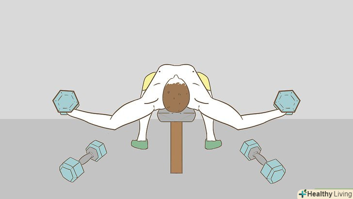 - Робіть жим лежачи. жим лежачи - найефективніша вправа для розвитку грудних м'язів. Підняття великої ваги з декількома повторами-кращий спосіб нарощування м'язів. Ви можете використовувати для цієї вправи штангу, спеціальний тренажер або навіть просто гантелі. [3]