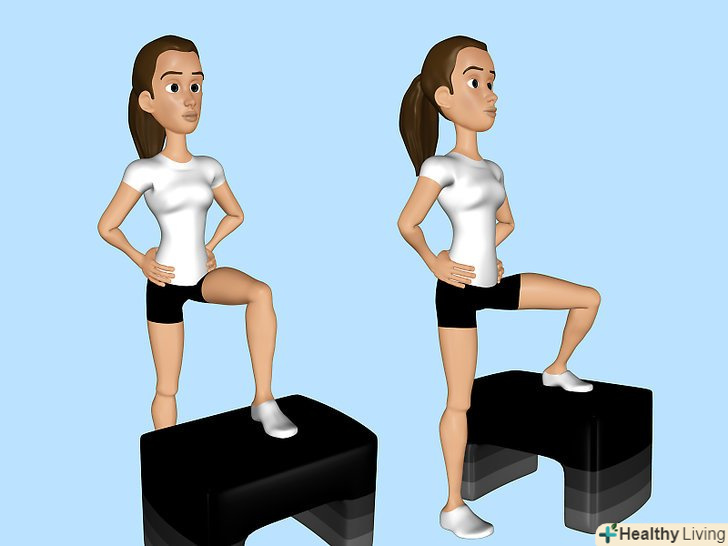 - Робіть кроки в сторону, щоб зміцнити стегна і зовнішню частину стегон. Поставте праву ногу на лаву, піднімаючись і опускаючись з іншого боку правою ногою. Повторіть по 10 разів для кожної ноги.