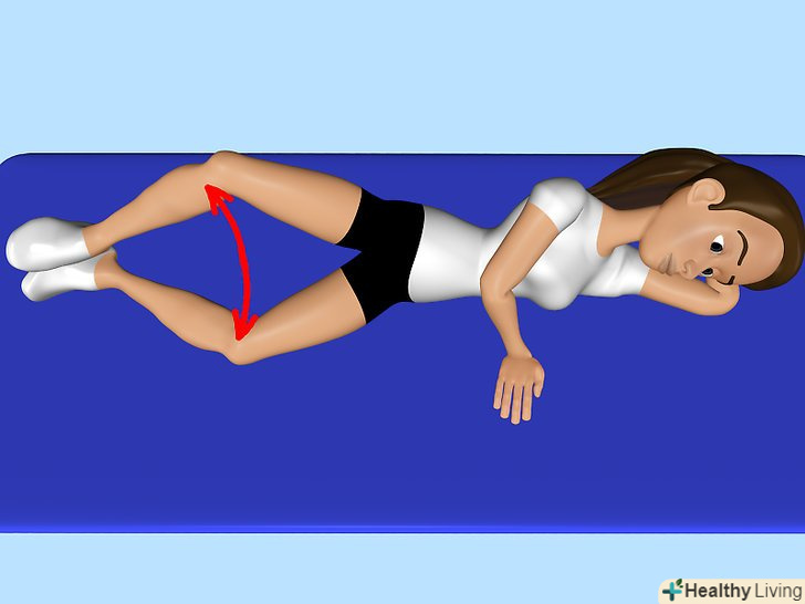 Виконуйте вправу» черепашка " для внутрішньої сторони стегон. лягайте на бік, спираючись на лікоть.- Розташуйте коліна перед вами, як якщо б ви сідали на стілець. Розведіть коліна, при цьому п'яти повинні бути разом. Зупиніться і опускайте ваші коліна до тих пір, поки вони не зустрінуться. Виконайте 20 разів і стежте за тим, щоб вся напруга доводилося на стегна.