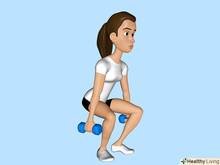 Виконуйте присідання, спрямовані на сідниці і стегна. завжди затискайте прес і розслабляйте спину.- Візьміть в кожну руку по гантелі вагою в 2 кг.розташуйте руки з боків. Стегна розставлені широко. Присідайте, як ніби ви намагаєтеся сісти на невидимий стілець. Піднімайте пальці на ногах, щоб вага припадав на п'яти. Як тільки ваші стегна досягли кута 90 градусів з вашими литками, зупиніться на 2-5 секунд. Поверніть тіло у вихідне положення.