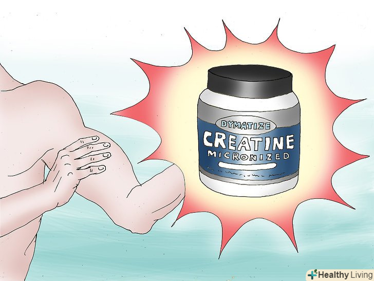 Розгляньте можливість застосування добавок. багато, хто працює над нарощуванням м'язів, вживають креатин, амінокислоту у вигляді порошку, який розводять з водою і приймають три рази на день або частіше. Його вживання вважається безпечним FDA (Управлінням з контролю якості харчових продуктів і лікарських засобів), так як він складається з того ж білка, що виробляє наш організм. [2]