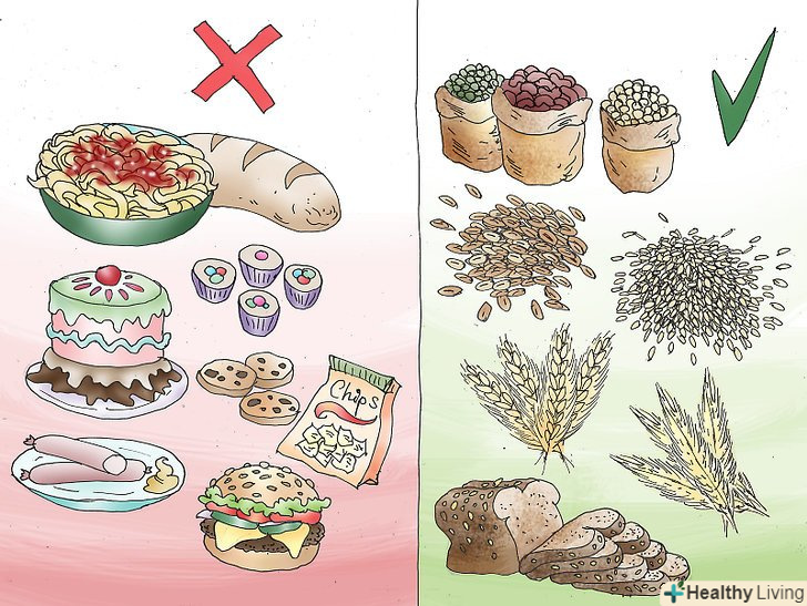 Не вживайте багато калорій. багато хто вірить в те, щоб наростити великі м'язи потрібно споживати багато калорій. Споживати достатньо калорій необхідно для того, щоб отримувати достатньо енергії під час тренування. Але їх зайве споживання призведе до того, що організм буде витрачати всю енергію на спалювання жиру замість нарощування м'язів. У тілі з малим вмістом жиру м'язи більш помітні візуально.- Утримайтеся від вуглеводів в чистому вигляді, таких як паста (макарони), білий хліб, тістечко і інша випічка. Їжте страви з необробленого зерна.