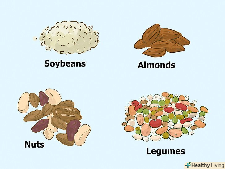 Включіть в свій раціон білки рослинного походження. якщо ви не їсте м'ясо, вам буде складніше прискорити зростання м'язів, однак це можливо. Навіть якщо ви вживаєте м'ясо, слід доповнити його рослинними білками. [13]- Прекрасними джерелами білка є соєві боби, горіхи і бобові. Наприклад, мигдаль являє собою хорошу легку закуску, яку можна їсти перед тренуваннями і додавати в протеїновий коктейль.