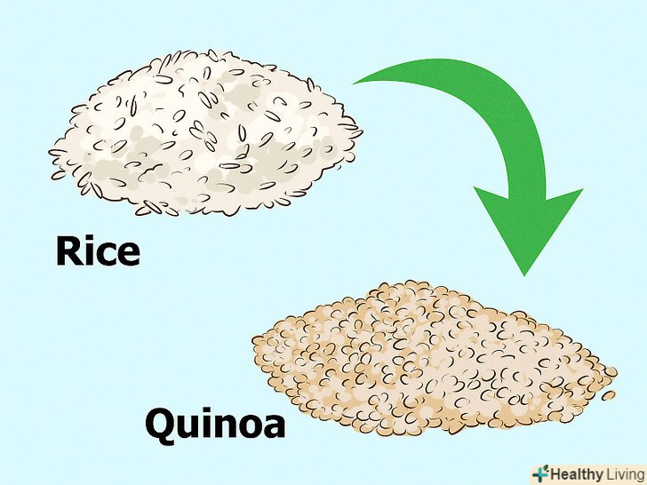Замініть рис на кіноа. у зерні кіноа міститься більше білків і харчових волокон, ніж в рисі або вівсі. Крім того, кіноа багата марганцем, магнієм і фосфором. У продажу є червона, чорна і біла кіноа. [17]
