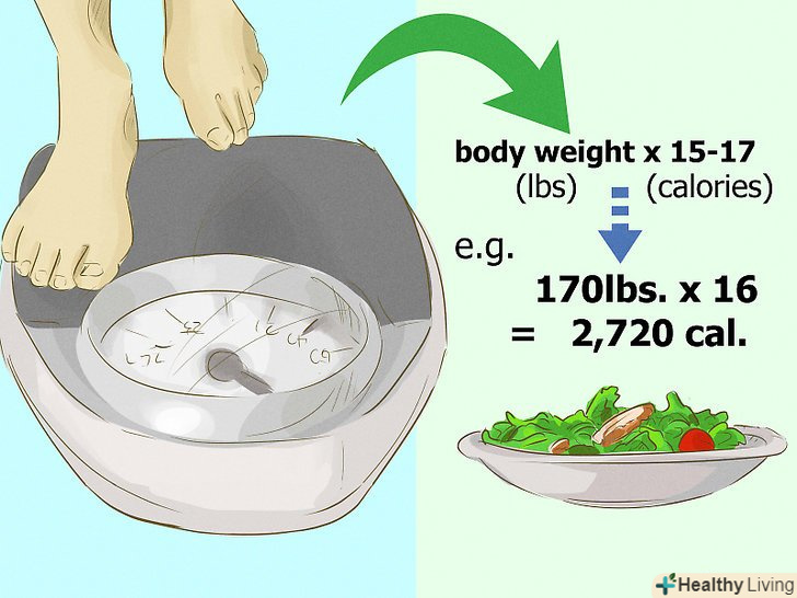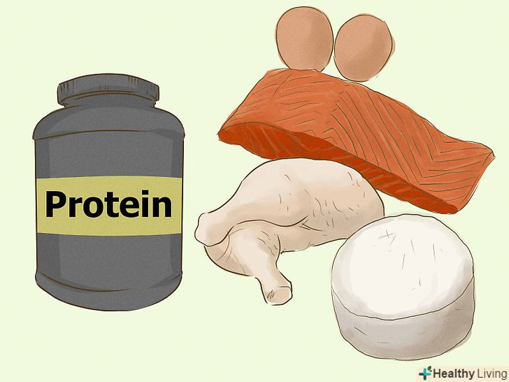 Споживайте надмірну кількість калорій. ваші м'язи не стануть більше і сильніше, якщо ви не забезпечите свій організм їжею, яка потрібна йому для збільшення м'язової маси. Щоб оцінити, скільки калорій вам необхідно, помножте свою вагу в кілограмах на 33-37 калорій (наприклад, якщо ви важите 80 кілограмів, вам слід споживати приблизно 2700-2900 калорій в день). Якщо за кілька тижнів ваша м'язова маса не збільшиться, Підвищіть кількість калорій на 10%. [10]- Щоб дізнатися, як отримати калорії, необхідні для нарощування м'язової маси, порадьтеся з бодібілдерами або пошукайте інформацію на спеціалізованих сайтах.