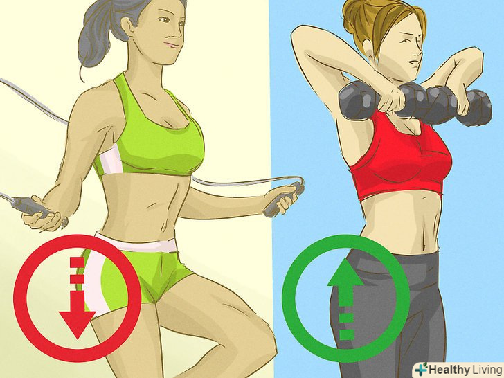 Займайтеся помірними кардіо-вправами. хоча кардіо-вправи важливі для підвищення витривалості і зміцнення серцево-судинної системи, занадто велика їх кількість може уповільнити ріст м'язів. Якщо ви хочете збільшити свої м'язи, основний упор слід зробити на анаеробні вправи, наприклад підняття важких предметів. [9]- Обмежте кардіо-тренування 75 хвилинами інтенсивних вправ (наприклад, біг) або 150 хвилинами помірних навантажень (наприклад, ходьба) в тиждень.