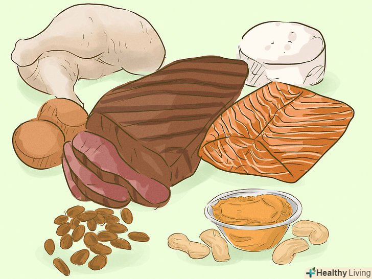Їжте багато білка. М'язам потрібен білок, щоб ставати великими і сильними, а коли ви щотижня займаєтеся, потрібно постачати їх їжею, багатою протеїнами. Урізноманітніть джерела білка: не все ваше "паливо" має добуватися з м'яса.- Курка, риба, пісна яловичина і свинина, а також інші види м'яса – це відмінні джерела білка. Решта продуктів тваринного походження, такі як курячі або качині яйця, теж стануть хорошим варіантом.