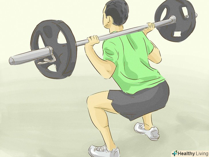 Тренуйте ноги за допомогоюПрисідань . Встаньте, ноги на ширині плечей. Використовуйте спеціальну стійку для присідань зі штангою або над кожним плечем тримайте по гантелі. Трохи нахиліться вперед, голову назад, згинайте коліна, поки стегна не будуть паралельні підлозі. Коліна не повинні виступати за кінчики пальців. Повільно поверніться у вихідне положення.- Зробіть від шести до восьми повторень в 3-4 підходи. Відпочивайте близько 45 секунд між підходами.