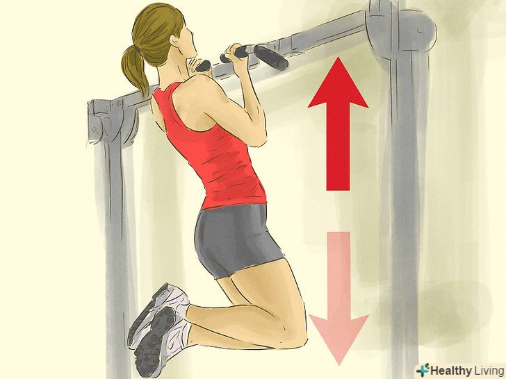 Збільште руки за допомогоюПідтягувань . Покладіть руки на турнік. Для підтягувань прямим хватом долоні розташуйте у напрямку від себе; для підтягувань зворотним хватом поверніть долоні до себе. Підніміть тіло, схрестивши ноги ззаду, поки ваш підборіддя не виявиться вище поперечини, потім повільно опустіться у вихідне положення.- Зробіть від шести до восьми повторень в 3-4 підходи. Відпочивайте близько 45 секунд між підходами.