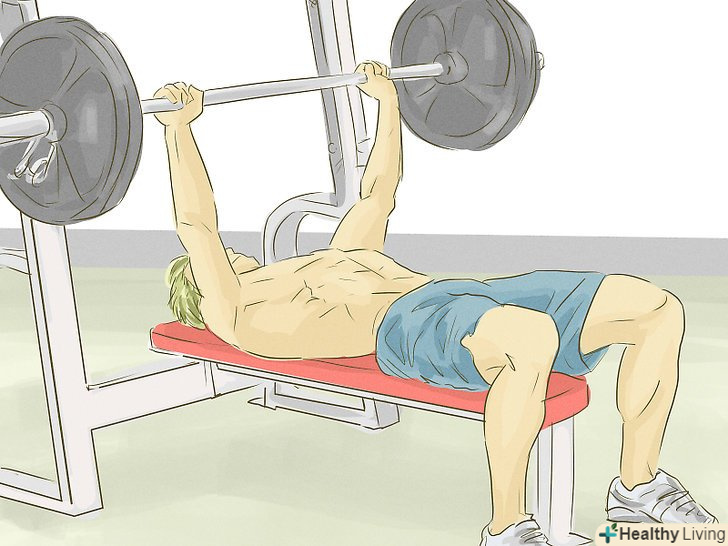 Робіть жим лежачи, щоб збільшити м'язи грудей. ляжте на лаву для жиму, ногами зіпріться в підлогу. Початкове положення-тримайте штангу або гантелі над грудною кліткою. Підніміть вагу над головою, витягуючи руки і випрямляючи лікті. Опустіть обтяження знову до грудей.- Зробіть від шести до восьми повторень в 3-4 підходи. Відпочивайте близько 45 секунд між підходами.
