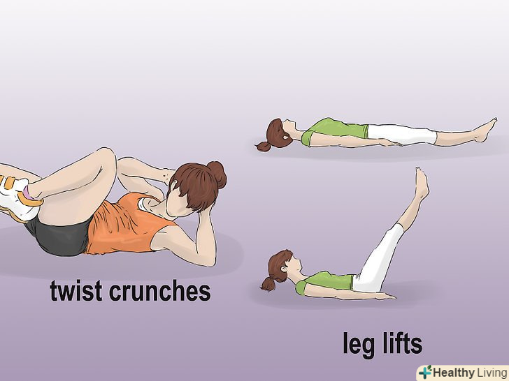 Зміцніть м'язи кора. робота над м'язами кора допоможе привести в тонус живіт, і він буде виглядати більш плоским і маленьким в порівнянні з попою. Для кращого результату виконуйте вправи для торсу хоча б три рази в тиждень. Почніть з таких:- Підйоми ніг. Можна подумати, що підйоми найбільше розвивають ноги, але, насправді, при їх виконанні задіяний черевний прес. Ляжте на спину і витягніть ноги перед собою. Зігніть ноги і підніміть їх, великі пальці при цьому повинні вказувати вперед. Випряміть ноги так, щоб вони вказували на стелю. Повільно опускайте ноги, Зупинившись приблизно на пару сантиметрів від підлоги. Повторіть 5 разів, потім відпочиньте 30 секунд.