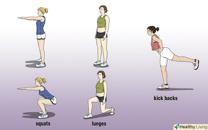 - Випад. Станьте прямо, ноги приблизно на ширині плечей. Праву ногу тримайте прямо, а ліву — зігніть, щоб зробити випад. Поверніться у вихідне положення, потім зробіть випад на іншу ногу. Зробіть 3 підходи по 20 повторень.