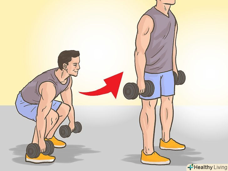 Займайтеся з гантелями. вправи для сідниць з гантелями зазвичай ефективні і показують швидкий результат. Пам'ятайте, що сідниці-це м'язи, тому силові тренування мають велике значення. Можна купити гантелі або взяти їх на прокат у фітнес центрі.- Зігніть коліна і підніміть гантелі. Гантелі потрібно тримати, захопивши їх зверху і зімкнувши пальці знизу. Це означає, що їх треба тримати таким чином, щоб долоні були спрямовані вниз і звернені до гантелей.