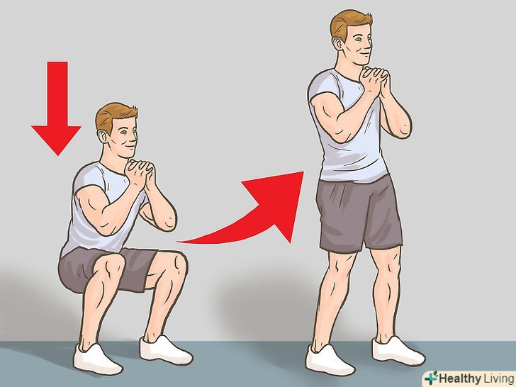- Іншим варіантом цієї вправи є утримання в приседе або пульсація. Виконуючи цю вправу, ви повинні поставити ноги на ширині плечей. Присядьте під кутом 90 градусів. Як тільки ви опинитеся в повному приседе, трохи піднімайтеся вгору, потім опускайтеся вниз. Ці рухи називаються пульсуючими. [2]