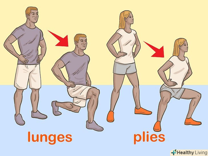 ЗробітьВипади і пліє. так само, як і присідання, випади і пліє є основними вправами, які досить швидко призводять до бажаного результату.- Щоб виконати випад, розставте ноги на ширині плечей. Шкарпетки повинні дивитися строго вперед. Зробіть крок однією ногою вперед, а інша повинна стояти на підлозі, при цьому коліно буде ковзати повз пальців ніг. Відштовхуйтеся п'ятою, щоб зберігати рівновагу. Потім підніміться у вихідну позицію і випрямтеся. Тепер поміняйте ноги і виконайте цю вправу ще раз.