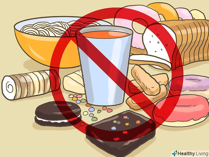 Намагайтеся виключити з раціону простіВуглеводи . прості вуглеводи небезпечні тим, що організм швидко перетворює їх в жирові запаси, якщо вони відразу ж не спалюються. Тому намагайтеся відмовитися від їжі, багатої простими вуглеводами, які містять одно - або двомолекулярний цукор, тому що організм дуже швидко їх спалює. [9]- Ось кілька продуктів, які варто виключити з раціону: патока, кукурудзяний сироп, мед. Цукерки та солодощі, безалкогольні солодкі напої, желе і джеми, фруктові соки. Ці продукти містять велику кількість простих вуглеводів.