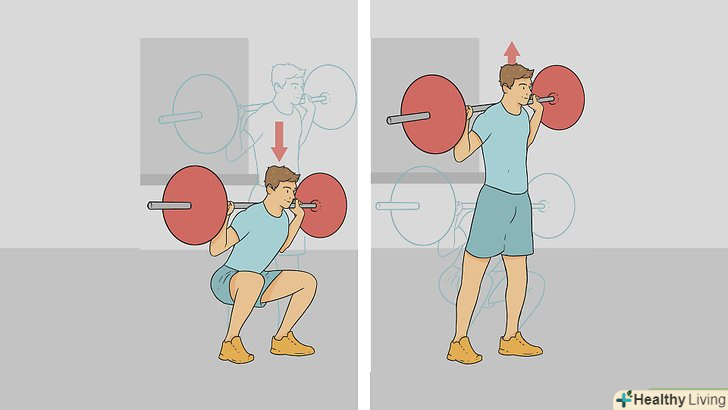 Починайте з невеликої ваги. неправильне положення тіла під час вправ або надмірні зусилля можуть призвести до травми коліна, спини або компресії хребта. Завжди спочатку відпрацьовуйте правильну техніку для кожної вправи з невеликою вагою. Тільки оволодівши ідеальною технікою, можете братися за більш серйозну вагу.- Виконуйте присідання зі штангою. це відмінний спосіб накачати м'язи стегон. Для штанги потрібно підібрати таку вагу, щоб ви могли виконати 8-10 повторів поспіль. Тримайте штангу обома руками на плечах. При бажанні замість штанги можна використовувати гантелі.