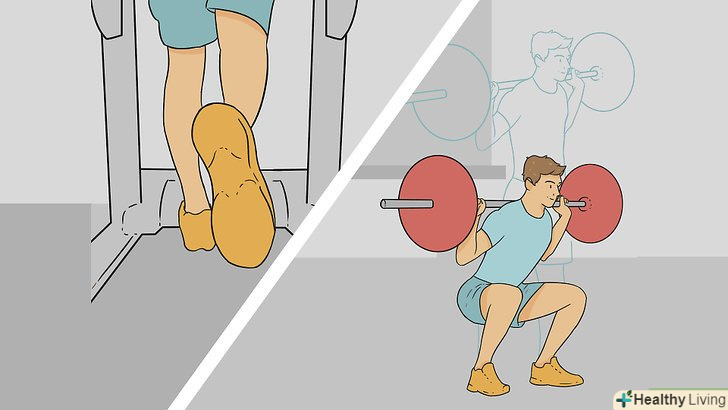- Виконуйте підйоми на носках. ця вправа допоможе вам накачати литкові м'язи, що буває не так-то просто зробити. Тримайте штангу або гантелі на плечах. Ноги на ширині плечей. Підніміться на носках, потім опустіться назад. Виконайте 3 підходи по 10-12 разів. [2]