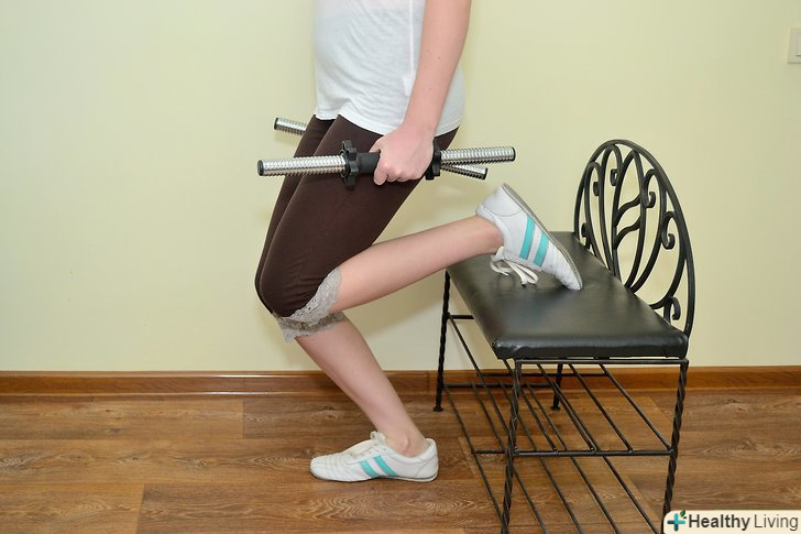 Витягніть одну ногу назад і розташуйте її на поверхні тренувальної лави. розслабте свої плечі.