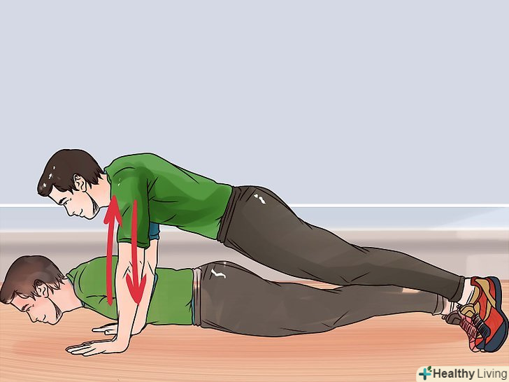 - Щоб розтягнути м'язи задньої поверхні стегна і спини, виконайте вправу «гусениця». [12] нахиліться вперед так, щоб руки дістали до підлоги. Рухайтеся руками вперед до тих пір, поки не встанете в упор лежачи. При упорі лежачи вага вашого тіла повинен припадати на руки і ноги, а між плечима і щиколотками можна було б провести пряму лінію. Тепер пройдіться ногами вперед, поки не торкнетеся рук. Повільно підніміться з розтяжки і повторіть весь процес 5 разів.