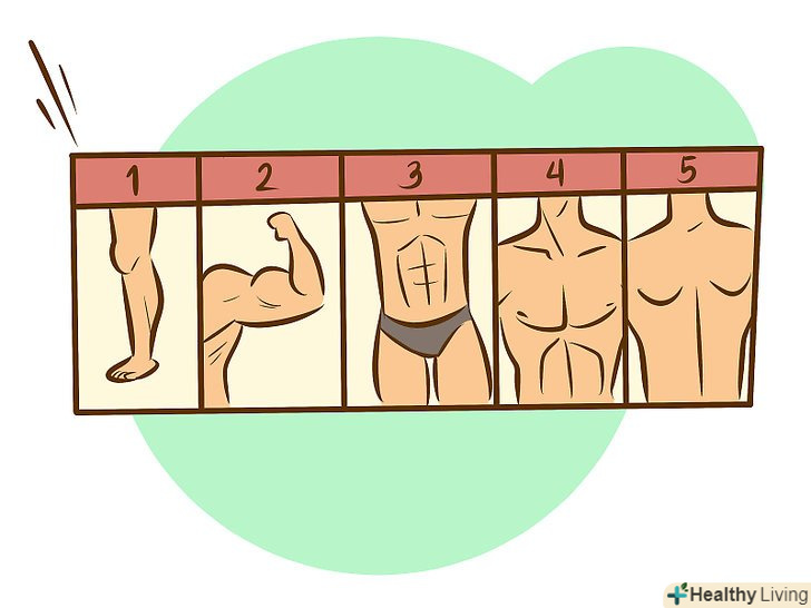 Визначте специфічні м'язи, які ви сподіваєтеся накачати. коли ви поставите, це хороша можливість перевірити свою симетрію, свої успіхи в наборі м'язової маси, і визначити місця, які потрібно ізолювати або попрацювати більш енергійно під час наступної щотижневої тренування. Що потрібно згладити? А що потрібно накачати? Які вправи знадобляться вам, щоб отримати бажані результати?- Взагалі це хороша думка поговорити з іншими тренерами і бодібілдерами в спортзалі, попросивши їх про оцінку. Багато що з культури бодібілдингу відбувається на цій стадії: наприклад, позування в тренажерному залі і консультація У інших спортсменів з приводу того, над чим вам потрібно попрацювати.