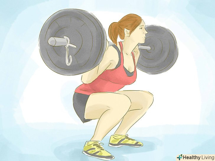 - Присідання з навантаженням на спину. Для цієї вправи вам буде потрібно стійка для присідань зі штангою з вагою, яка буде рухатися, коли ви будете присідати. [1] Станьте під штангу, візьміться за неї зворотним хватом. Присядьте, потягніть штангу або за голову, або до грудей. Присідайте до тих пір, поки стегна не будуть паралельні підлозі, потім поверніться у вихідне положення.