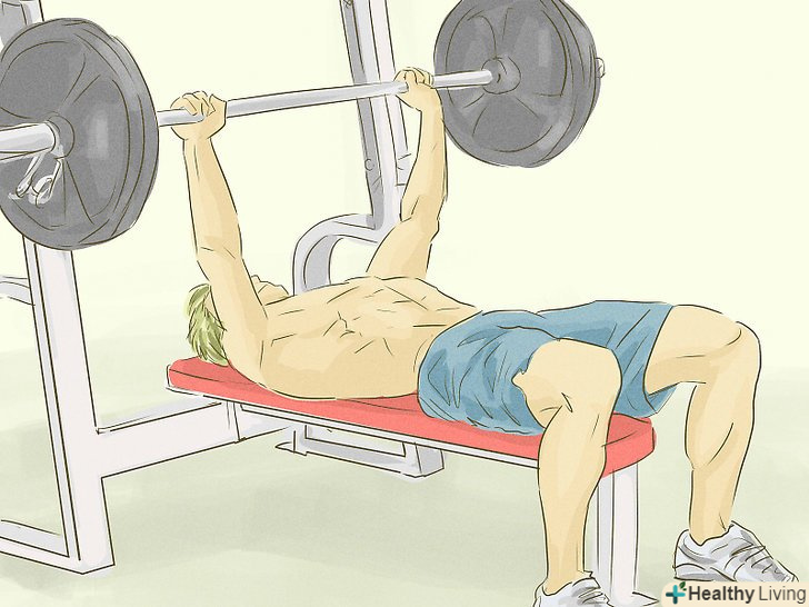 Навчіться тиснути вагу від грудей. це корисна вправа, яка допоможе вам зміцнити руки і грудні м'язи. Вам буде потрібно штанга і лава. Встановіть на штангу вагу, який ви зможете підняти близько 8 разів за сет. Згодом вага можна буде додавати. Правильно вправа виконується наступним чином:- Ляжте на спину на лаву. Зігніть ноги в колінах. Ступні повинні стояти в зручному положенні на землі.