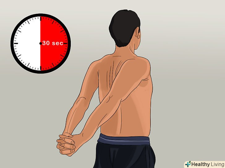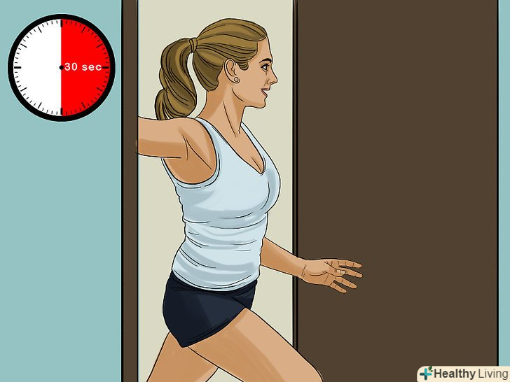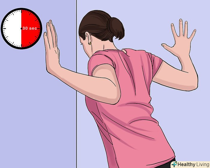 Затримайтеся в такому положенні на 30 секунд. затримайтеся в похилому положенні і продовжуйте розтягувати грудні м'язи. Якщо відчуєте біль, відкиньтеся назад, поки біль не пройде. [19]