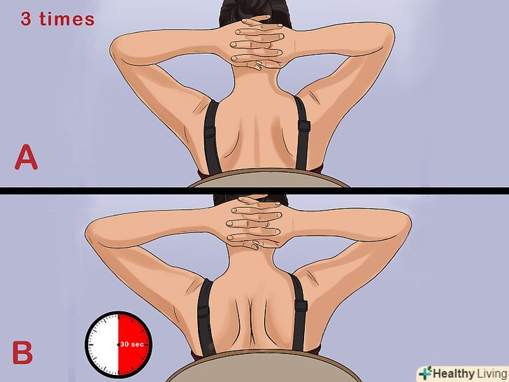 Затримайтеся в такому положенні на 30 секунд. перебуваючи в такому положенні, зведіть лопатки разом. Ви відчуєте, як м'язи в передній частині грудей почнуть розтягуватися. Під час розтяжки не забувайте глибоко дихати (вдихайте носом і видихайте ротом). [4]