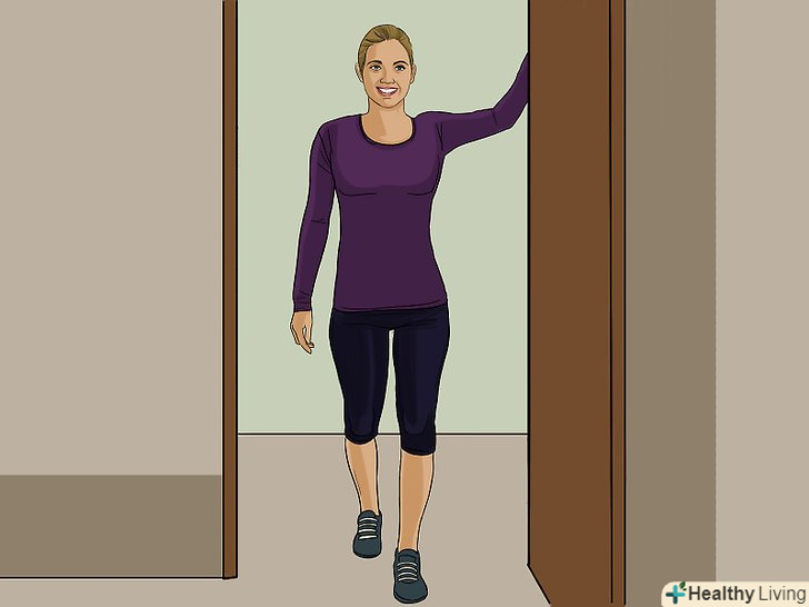 Станьте в дверному отворі і виставте одну ногу перед іншою. якщо ви хочете розтягнути ліві грудні м'язи, виставте вперед праву ногу і присогніте її. Під час розтяжки правих грудних м'язів попереду повинна стояти ліва нога. [16]- Якщо ви інтенсивно тренуєтеся або весь день проводите сидячи, ця розтяжка допоможе розтягнути хворі або скуті м'язи.