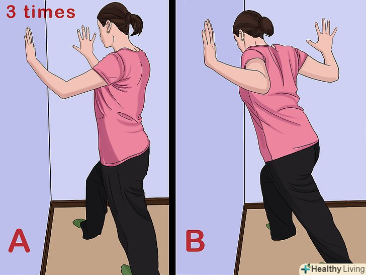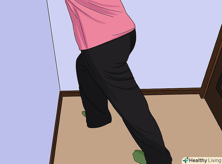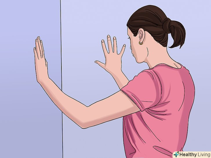 Покладіть руки на стіни. покладіть ліву руку на стіну зліва, а праву руку — на стіну справа. Ваша спина при цьому повинна залишатися рівною. Відстань між руками має становити близько 60-90 см. [2]