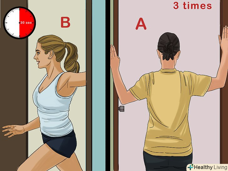 Повторіть вправу з іншого боку. іншою рукою упріться об протилежну сторону дверної рами. Не забудьте переставити ногу, щоб протилежна розтяжці нога стояла попереду і була злегка зігнута в коліні. Повторіть вправу і затримайтеся на 30 секунд. Виконайте ще 1-2 повторення з кожного боку, щоб гарненько розтягнути грудні м'язи. [20]