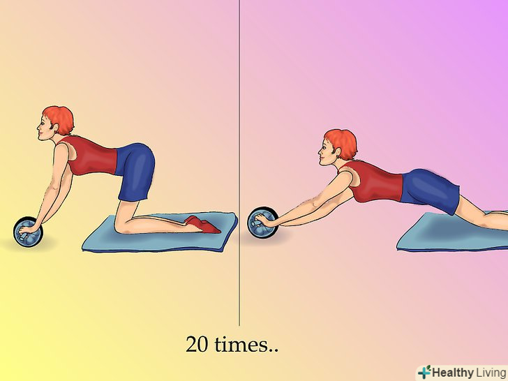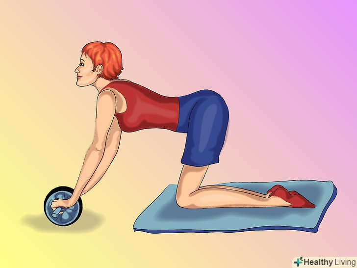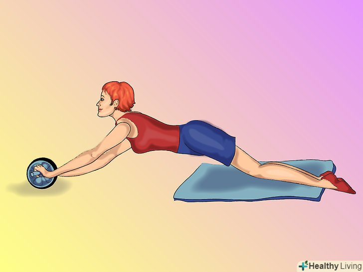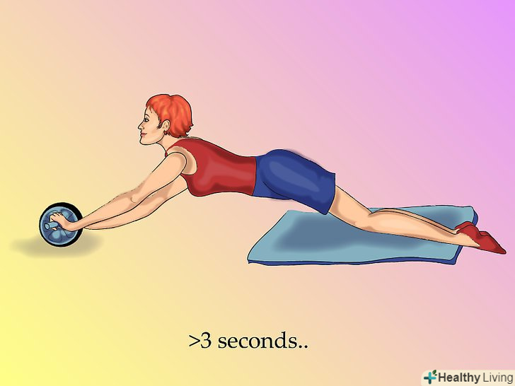 Напружте свої м'язи живота. почніть котити ролик вперед до тих пір, поки не нависніть над підлогою. Ваші коліна в цей час не повинні торкатися підлоги. Тримайте м'язи живота напруженими.