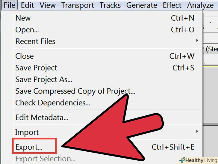 Зупиніть запис в Audacity. натисніть «File» - «Export». Введіть ім'я файлу та збережіть його у форматі WAV. Відредагуйте метадані (якщо хочете)і натисніть ОК.