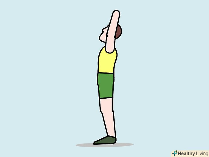 Виконайте розтяжку м'язів живота стоячи. Встаньте прямо, ноги на ширині плечей. Витягніть руки над головою якомога вище. Нахиліться назад і прогніться в спині, відчуйте розтягнення преса і грудних м'язів. Затримайтеся в цьому положенні на 20-30 секунд. Зробіть 2-4 повторення. [4]- Не нахиляйтеся занадто сильно, щоб не втратити рівновагу.