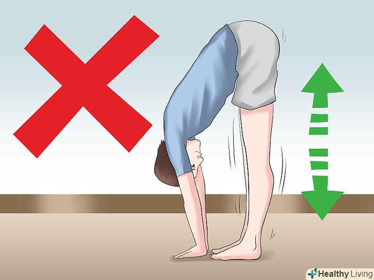 Не розгойдуйтеся під час виконання розтяжки. утримуйте положення тіла рівно, не послаблюючи і не посилюючи розтягнення. Розгойдуючись під час розтяжки, ви можете потягнути м'яз або отримати іншу травму. [13]