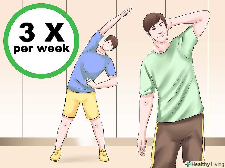 Виконуйте розтяжку однієї групи м'язів протягом декількох хвилин 2-3 рази на тиждень. якщо ви будете розтягувати одну і ту ж групу м'язів кожен день, ви ризикуєте отримати травму. Замість цього робіть розтяжку різних груп м'язів протягом тижня, витрачаючи на вправи не більше 3 хвилин. [15]Рада: намагайтеся в один із днів робити розтяжку м'язів живота, на наступний день — розтяжку ніг, ще через день зосередьтеся на грудних м'язах, шиї і плечах.