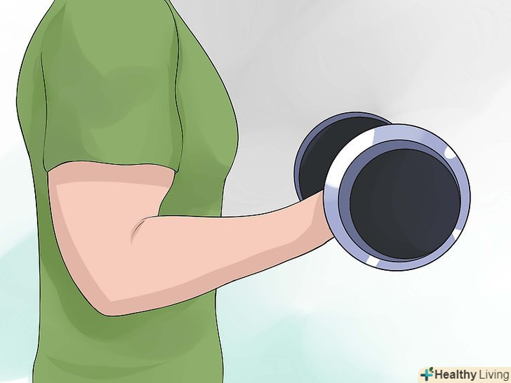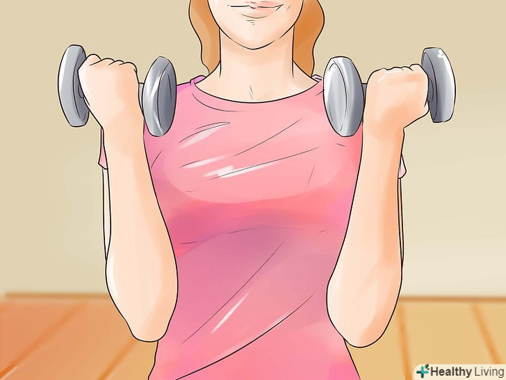 Купуйте вільні ваги або абонемент в тренажерний зал. хоча багато вправ можна виконувати і без інвентарю, гантелі, штанги і тренажери можуть підвищити інтенсивність тренувань. Щоб уникнути травм, почніть з невеликої ваги і не намагайтеся зробити більше, ніж можете. [22]- Використовуйте вагу, з якою вам складно працювати, але який дозволяє вам виконувати вправу правильно. Дивіться на себе в дзеркало, стежте за тим, щоб всі рухи були плавними, чіткими і контрольованими. Якщо вам здається, що ви втратите рівновагу, або вам складно зробити все повторення, замініть вагу на більш маленький. [23]